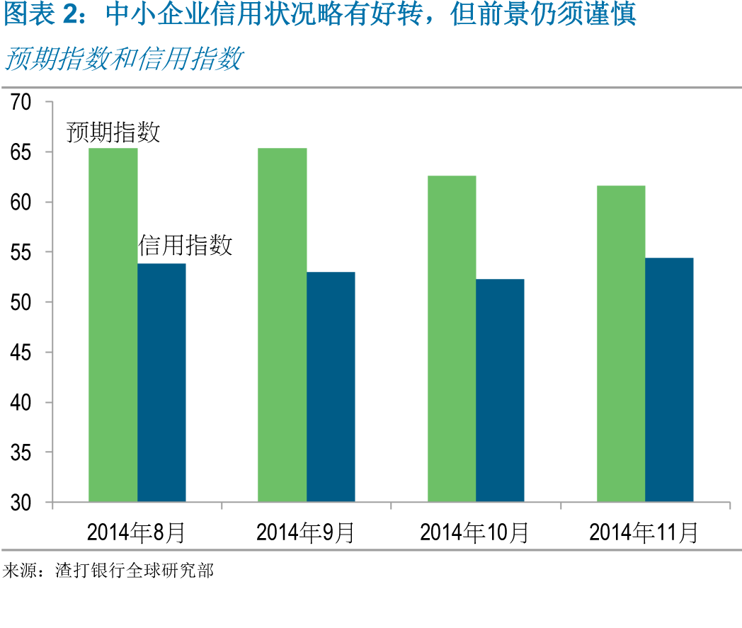 渣打银行认为目前中小企业基本面仍显疲弱。近日央行宣布降息,符合此前的预期。渣打银行预计央行还将在2015年一季度再度降息,以降低企业融资成本,支撑经济增长。深入分析11月中小企业信心调查及结果,得出如下主要发现: