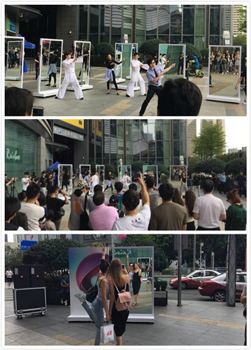 在行为艺术活动开始之前,用6面高大华丽的镜子吸引用户停留,通过激烈热情的现代舞引燃现场。为了突出GOME国美手机“一眼一世界,开启你的虹膜空间”的slogan。180China巧妙借助镜子的空间反射效果阐释了产品的虹膜空间功能。结合现场送机的方式让目标群体直观的体会到GOME国美手机最新黑科技虹膜解锁技术的私密安全,以及人体工学设计带来的舒适与便捷。
