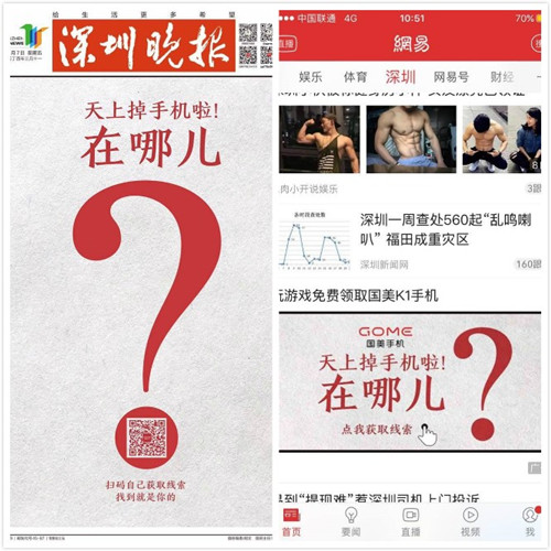 4月 7日,深圳晚报、深圳都市报头版版面,网易新闻客户端深圳频道同时出现:「天上掉手机了?在哪儿?」相关文案。一时间,深圳市民议论纷纷,各种猜测不断拉升关注者好奇的胃口。