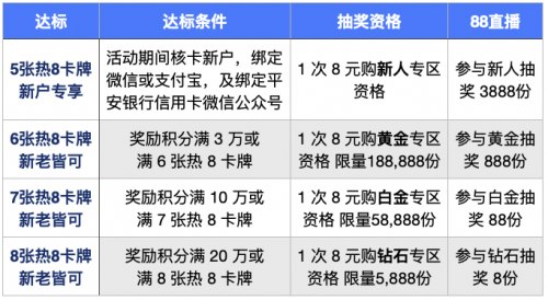 (注:7张卡牌也有购黄金专区资格,可参加黄金抽奖;8张卡牌也有购黄金专区和白金专区资格,可参加黄金、白金抽奖)